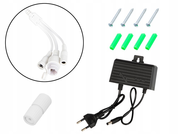 Dedykowany zasilacz DC 12V/2A z wtykiem DS 2,1/5,5mm w zestawie z urządzeniem. W opakowaniu znajdziemy także kołki montażowe, zabezpieczenie połączenia kabla, instrukcję obsługi.